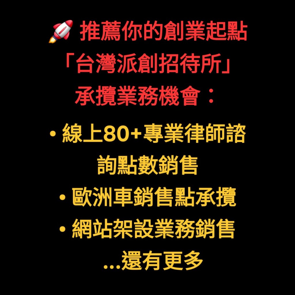 - 全國首創的「法可夢線上法律諮詢服務」,超過80+專業律師提供專業法律諮詢服務,台灣派創業招待所提供「線上諮詢服務點數及律師法律顧問證書」之創業推廣服務機會。